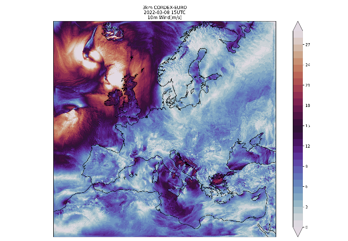 Other advantages of the high resolution can be seen when looking at wind speed. Here, not only are Fronts much more pronounced, the complicated wind systems near and induced by mountains are much more clearly visible (for example near the Adriatic sea), but also over the oceans, where the storm fields of mid-latitude lows show greatly enhanced detail.